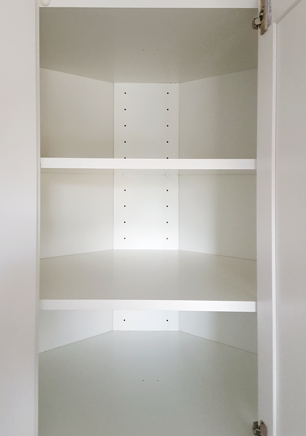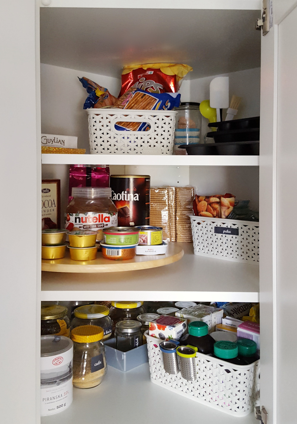 Kotna omara v kuhinji je velikokrat najbolj neorgaizirana omara v prostoru. Sedaj že veliko kuhinjskih modelov ponuja vrtilne notranje police in le-to ima tudi spodnja kotna omara v naši kuhinji. Vrtljiv model je priročen, ker omogoča dosegljivost vseh shranjenih predmetov. A pri zgornji kotni omari namenoma nisem izbrala takšnih polic, ampak čisto navadne. Razlog za to je moja višina. Ker v višino 2 metra ne dosežem z lahkoto, nisem videla smisla v vrtljivih policah, vedela pa sem, da me po taki izbiri čaka še en organizacijski projekt.