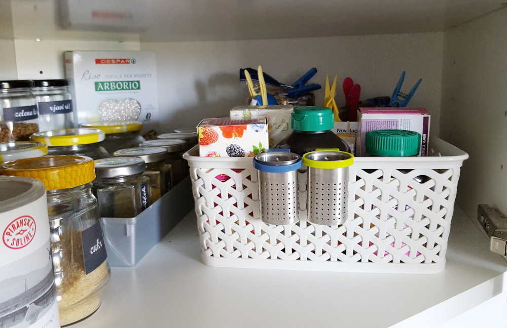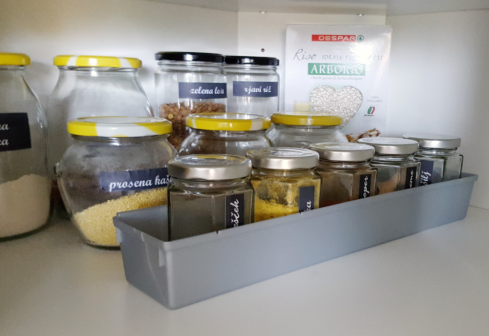 Na levi strani spodnje police shranjujem živila, ki jih največ uporabljam. Shranjena so v kozarcih, zaloge pa v košari. Če stvari postavljamo po višini, lahko vidimo tudi tiste, ki se nahajajo v ozadju. V ospredju so kozarčki z začimbami, ki so vrstno postavljeni v daljši PVC posodi. Ta je namenjena lažji dosegljivosti začimb, ker to posodo lahko preprosto izvlečemo in dosežemo prav vse. Na desni strani v ozadju shranjujem zaloge v košari (vrečke z moko, drobtinami, rižem in podobno), v ospredju pa košaro s čaji in prehranskimi dopolnili, ki so v dnevnem obtoku.