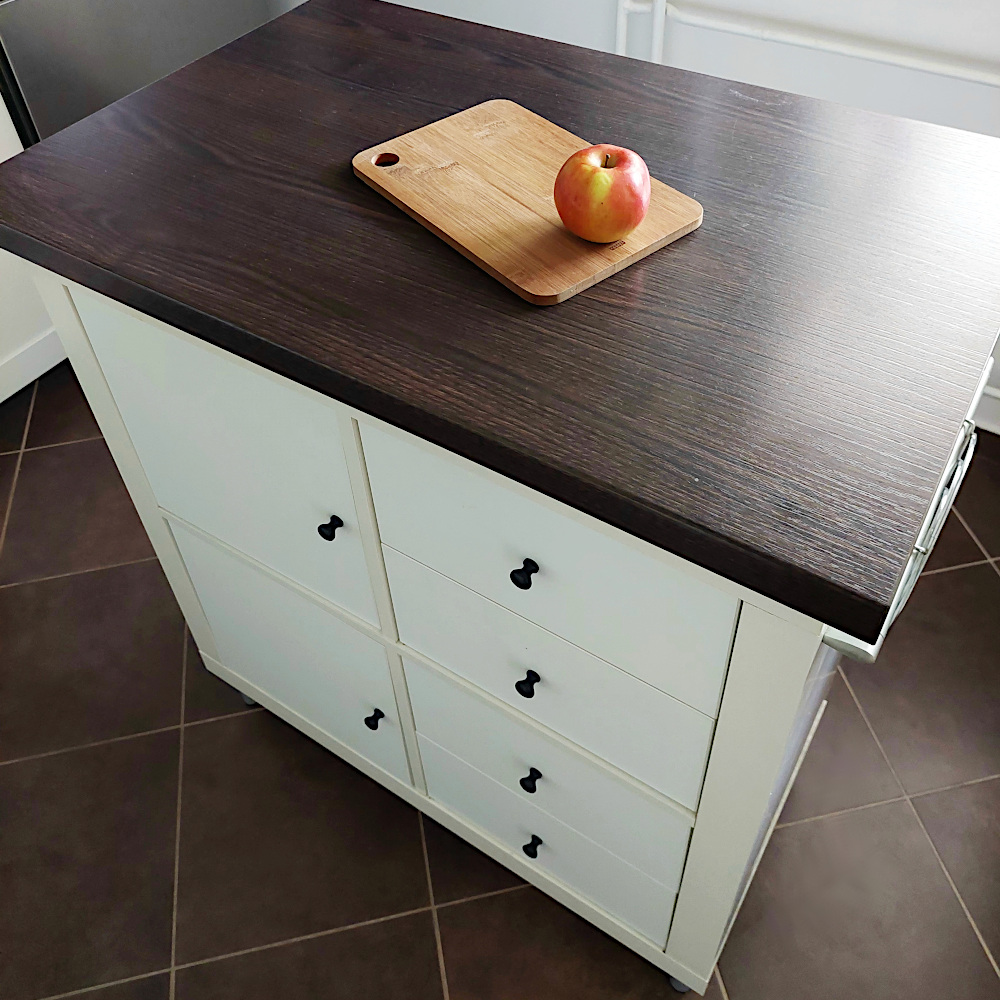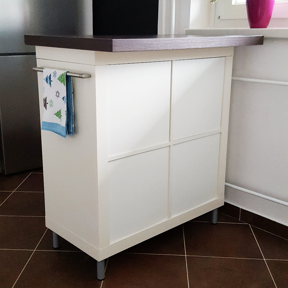 Kuhinjski otok na zgornjih slikah je nastal iz štirikotne omare s policami, ki je med selitvijo na površini utrpela manjše poškodbe. S kosom kuhinjskega pulta (izrezan po meri) sem prekrila poškodbo, z manjšimi pohištvenimi nogami pa sem ga povzdignila na višino preostalih spodnjih kuhinjskih elementov. Dodala sem vratca in predale, ki so na srečo že vsebovali lepo belo ozadje in na strani dodala ročaj za obešanje manjših predmetov. Sčasoma sem zamenjala še ročaje na vratcih in predalih za lepši videz. Sama prenova je stala manj kot 90 €, v kuhinji pa imamo sedaj več prostora za shranjevanje.