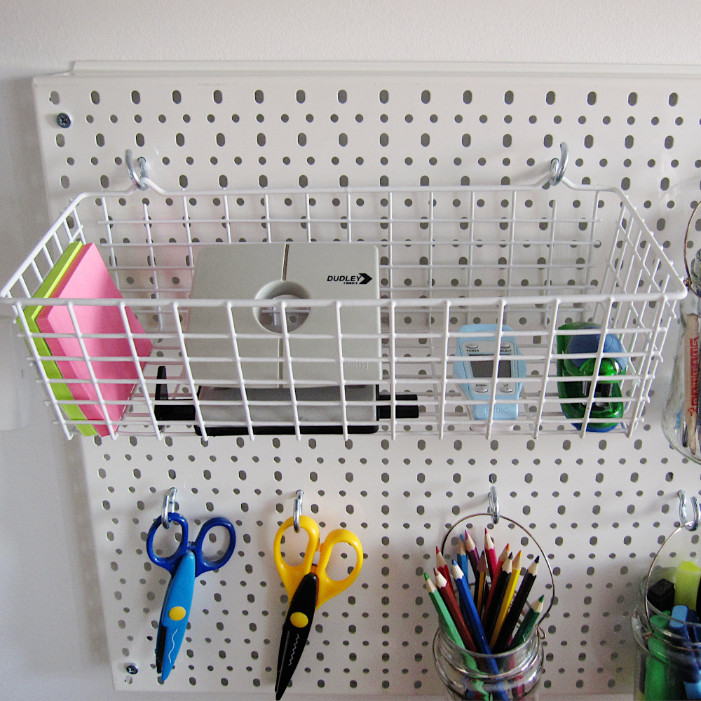 Na vijake lahko obesimo tudi mrežaste košare, v katerih shranjujemo pripomočke, kot so luknjač, spenjač, samolepilni listki in podobno. Če se luknjičasta tabla nahaja v bližini električnega stikala, pa je košara primerna tudi kot stalno mesto za polnjenje mobilnega telefona.