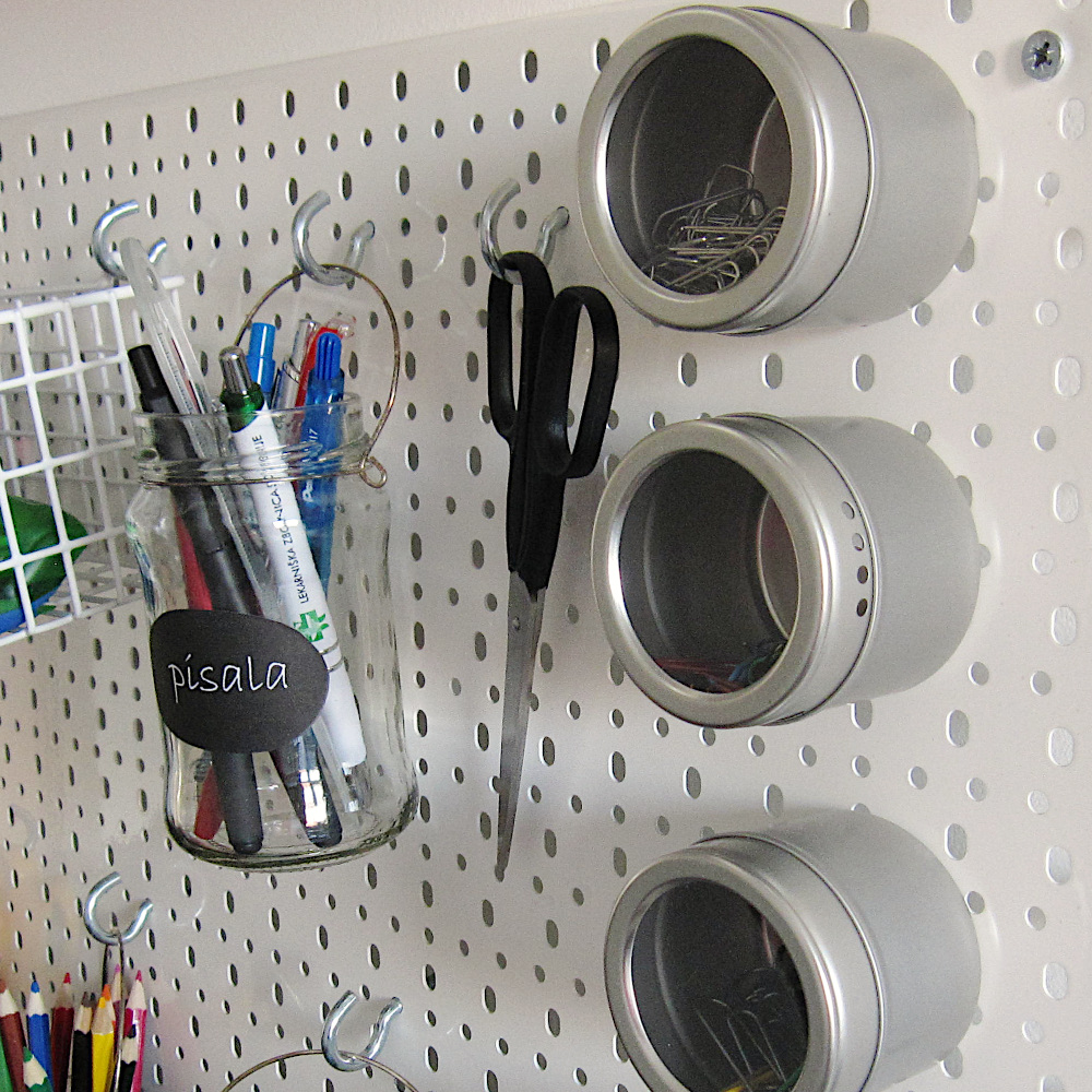 Pri organizaciji luknjičaste table lahko uporabimo različne pripomočke, kot so kljukasti vijaki, manjše košare za obešanje, stekleni kozarci in magnetne kuhinjske posodice za začimbe.