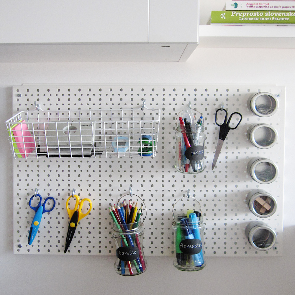 Luknjičasta tabla je tudi dobra rešitev, da z namiznih in delovnih površin umaknemo odvečne stvari in sprostimo prostor. Tako je preostanek mize vedno takoj na voljo za pisanje, risanje in druge ustvarjalne projekte.