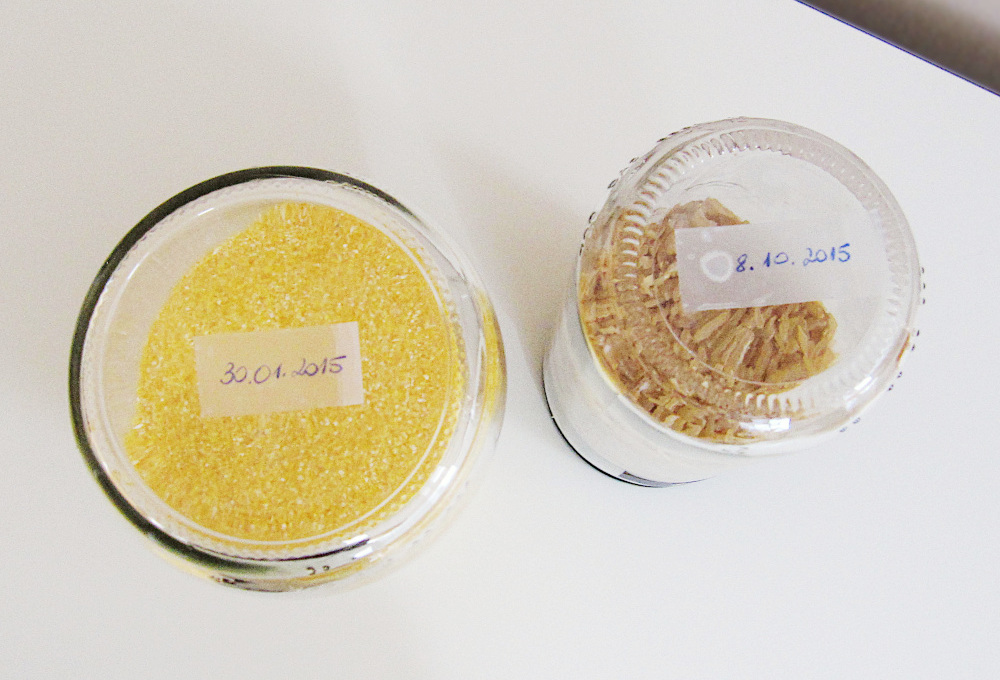 Ko enkrat pretresemo hrano iz vrečke ali škatle v steklene kozarce, lahko pozabimo na rok uporabe. Da do tega ne bi prišlo, sem datum uporabe napisala na lepilni trak in ga prilepila na dno kozarca.