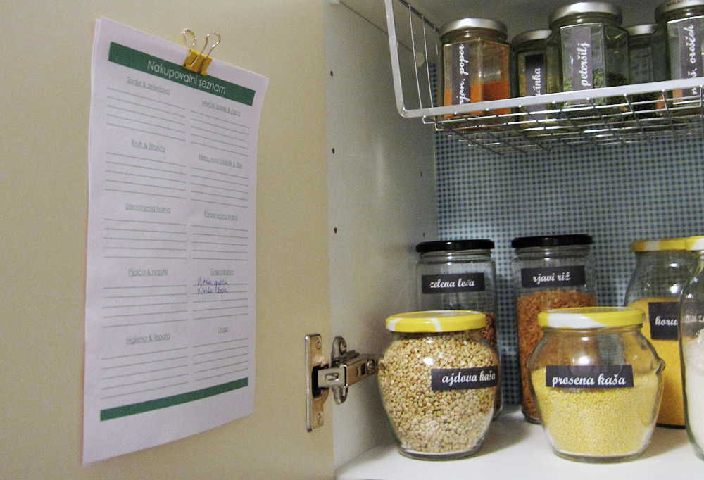 Prostor v omaricah rada izkoristim, kolikor se le da, zato včasih tudi vrata prilagodim potrebam shranjevanja. Tokrat sem podobno rešitev uporabila v kuhinji. Na notranji strani vrat shrambe sem prilepila navadno pisarniško sponko, s katero lahko pritrdim svoj nakupovalni seznam. Svetujem, da levičarji (ne mislim politično usmerjenost) seznam pripnete na desno vratno krilo, desničarji pa na levo. Tako boste lažje zapisovali vse potrebne izdelke na seznam.