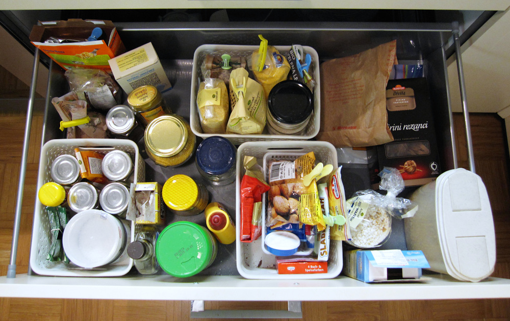 Trenutno živim v najemniškem stanovanju in skoraj vse prehranske izdelke hranim v večjem predalu pod kuhinjskim pultom. A tak način ni zagotavljal dobre preglednosti kljub košaram, ki naj bi pomagale pri razvrščanju in kategorizaciji. Zato sem se odločila, da spremenim namembnost omar.