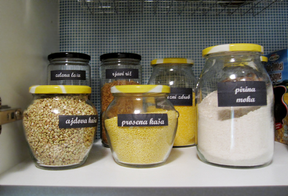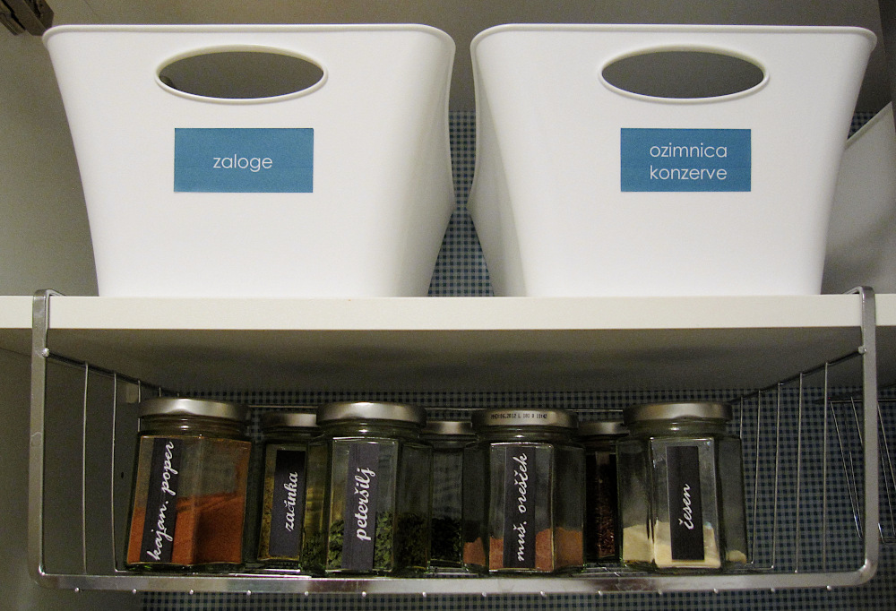 Polica je bila sprva postavljena na sredini omare. Težava pri takih razporeditvah je v praznem prostoru, ki ostane zaradi tistih izdelkov, ki v celoti ne morejo zapolniti višine prostora. Polico sem dvignila za približno 10 cm. Investirala sem v dve žični košari s posebnimi nastavki za obešanje in tako ustvarila dodatni vertikalni prostor. Prav tako sem kupila košare za zgornje police, ki pomagajo pri shranjevanju stvari, ki jih ne potrebujem pogosto, kot so dodatne zaloge, konzerve in ozimnica. Vse sem označila z nalepkami. Škatlo na desni strani sem poimenovala domača lekarna, ker vsebuje sirup proti kašlju, probiotiki, žajbljev čaj in podobno.