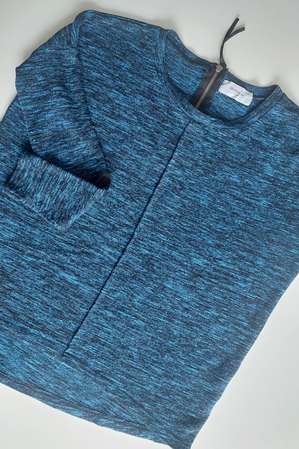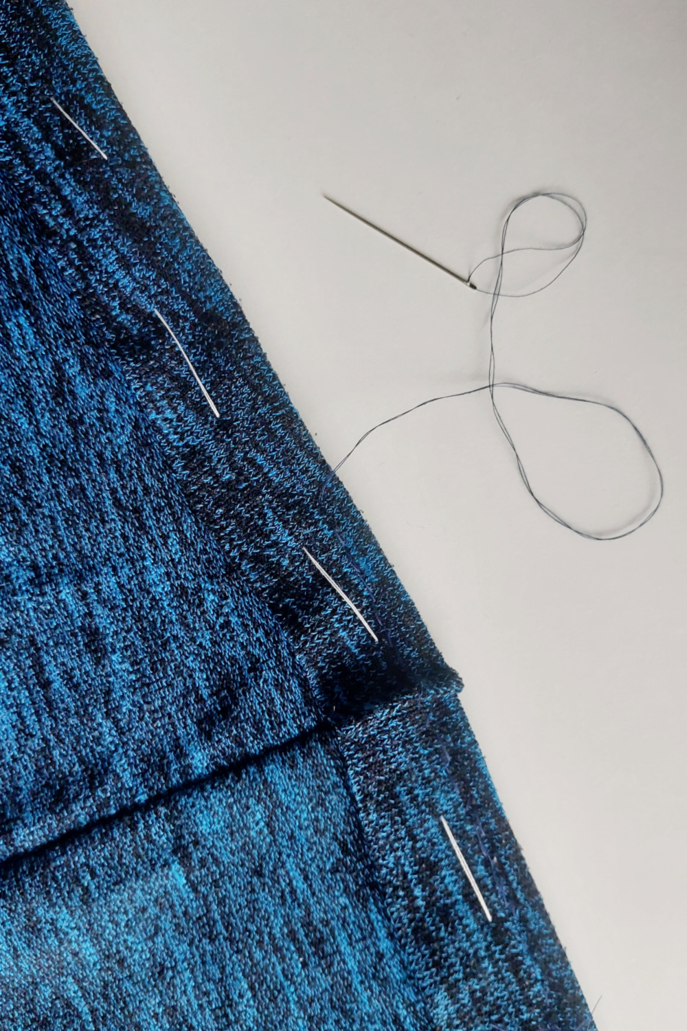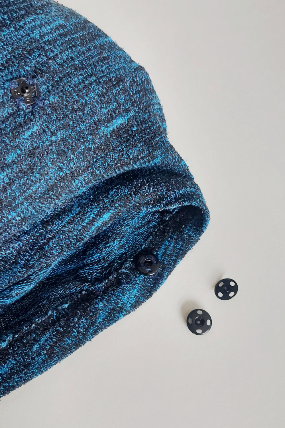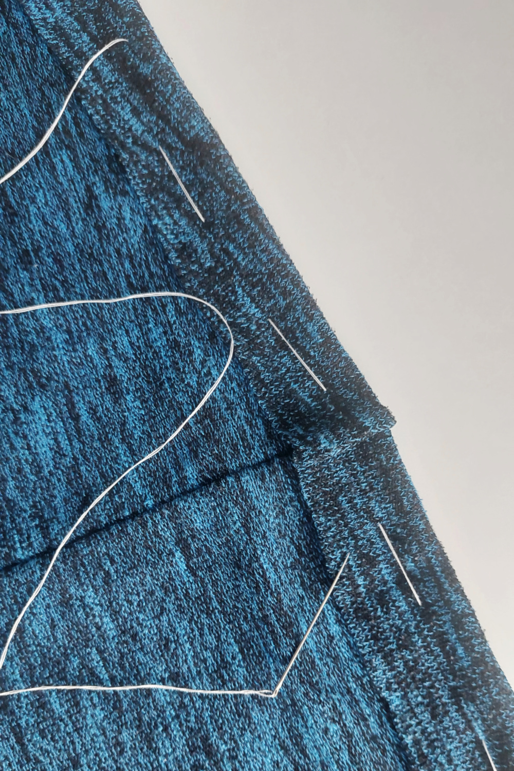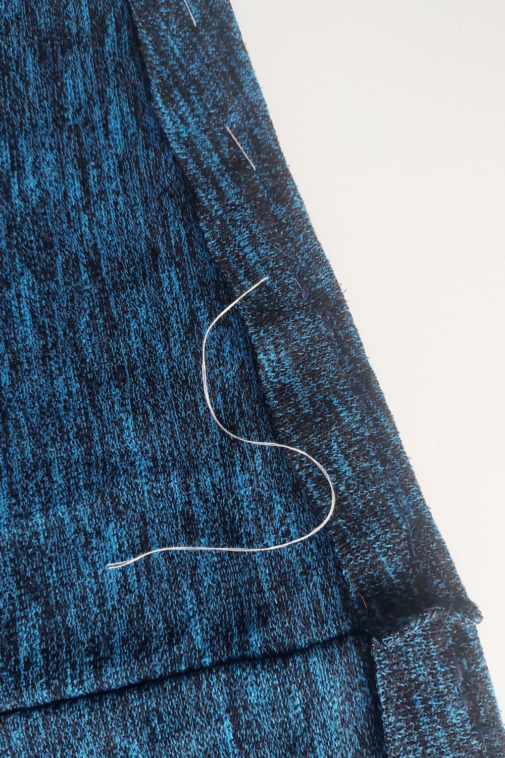 - Nato pripravimo nit v barvi puloverja in z njo z manjšimi šivi natančno zašijemo skupaj oba roba. Pazimo, da ne prečkamo belo nit.