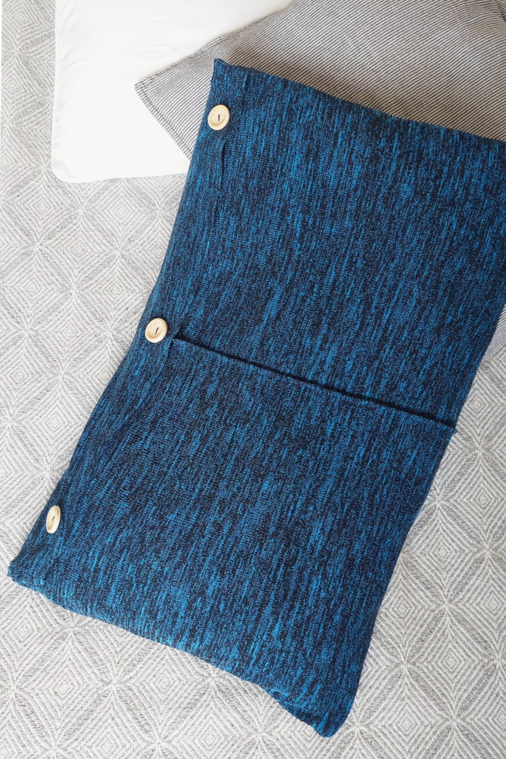 Prevleka za okrasno blazino, ki je narejena iz starega puloverja, je preprost DIY projekt, kjer potrebujemo le nekaj ročnih spretnosti. Šivalni stroj je dobrodošel, ni pa nujen. Zadostuje že, če poznamo osnove ročnega šivanja. Prav tako ne potrebujemo zadrge. Namesto te uporabimo gumbe za notranje zapenjanje oz. pritiskače, ki jih lahko prišijemo in nekaj okrasnih gumbov.