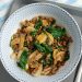 Pirini rezanci s čebulo, šampinjoni in mlado špinačo
