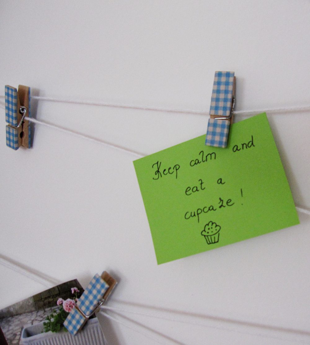 Za obešanje sporočil, fotografij, razglednic, receptov in drugih predmetov v papirnati obliki lahko uporabljamo manjše lesene kljukice. Te lahko obdržimo v njihovi naravni barvi ali pa jih dodatno okrasimo s trakovi Washi (okrasni lepilni trakovi).